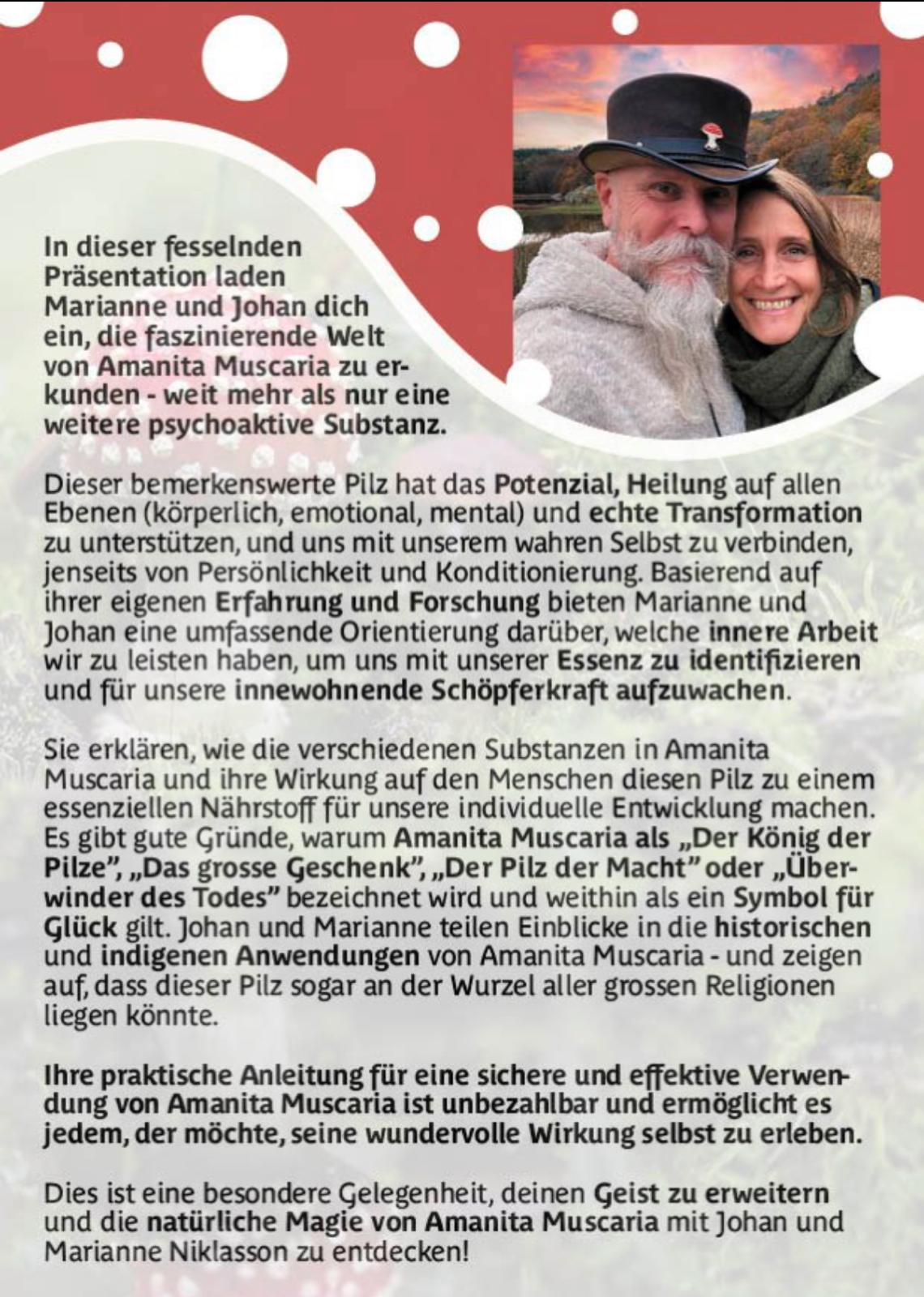 « Alle Veranstaltungen Diese Veranstaltung hat bereits stattgefunden. Amanita Muscaria Juli 20, 2024 @ 10:00 - 13:00 Kostenlos Kakao und Feuerzeremonie » Zum Kalender hinzufügen Google Kalender iCalendar Outlook 365 Outlook Live Details Datum: Juli 20, 2024 Zeit: 10:00 - 13:00 Eintritt: Kostenlos Website: www.sh-institut.com Veranstalter Simgo Healing E-Mail info@sh-institut.com Veranstalter-Website anzeigen Veranstaltungsort Kräutersaal Hochkogl 33 Oberschlierbach, Oberösterreich 4554 Österreich Google Karte anzeigen Telefon +43 664 39 38 930 Veranstaltungsort-Website anzeigen Kommentar absenden Antwort abbrechenDeine E-Mail-Adresse wird nicht veröffentlicht. Erforderliche Felder sind mit * markiertKommentar * Name * E-Mail * Website Meinen Namen, meine E-Mail-Adresse und meine Website in diesem Browser für die nächste Kommentierung speichern.